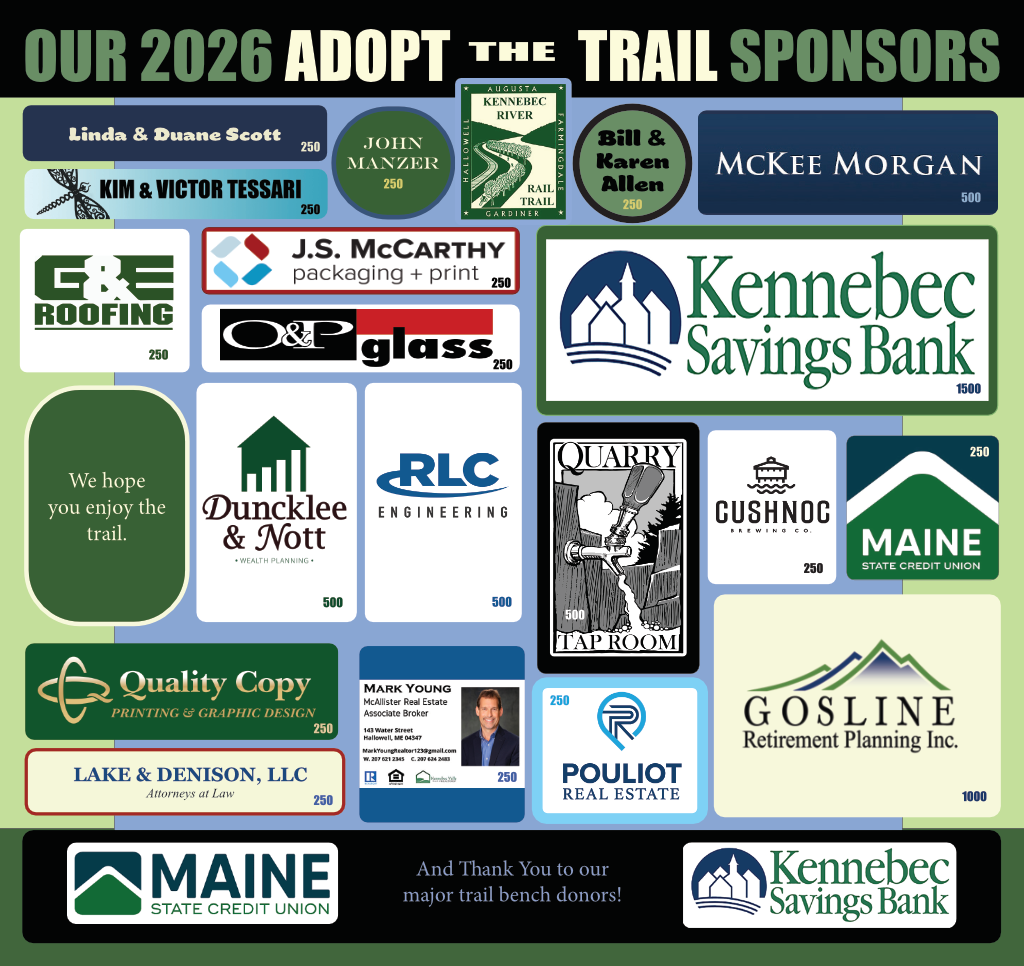 The Friends of the Kennebec River Rail Trail was formed as a non-profit in 1996 to assist in the construction, maintenance and promotion of the 6.5 mile long rail trail from Augusta to Gardiner Maine. As a non-profit, the Friends of the Kennebec River Rail Trail relies on its members for financial support and volunteering to assist in the maintenance of the trail as well as financial contributions from business and foundations.